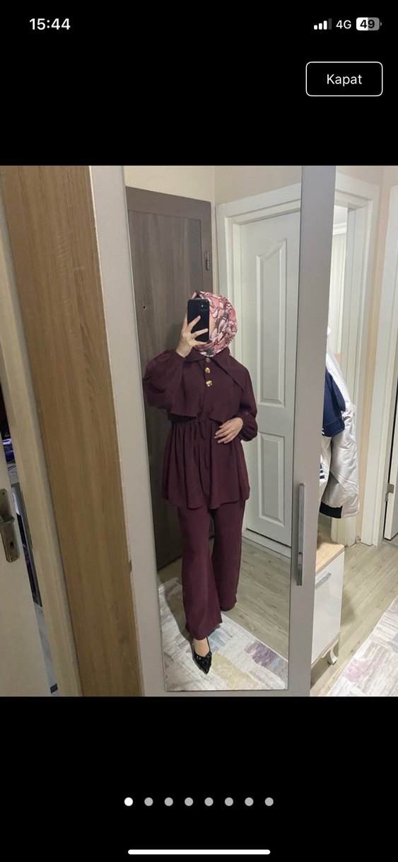 Bordo renkli, düğmeli, yüksek yakalı ve uzun kollu kadın takımıdır. Rahat kesimi ve midi boyu ile günlük kullanıma uygundur. Minimalist ve desensiz tasarıma sahiptir.