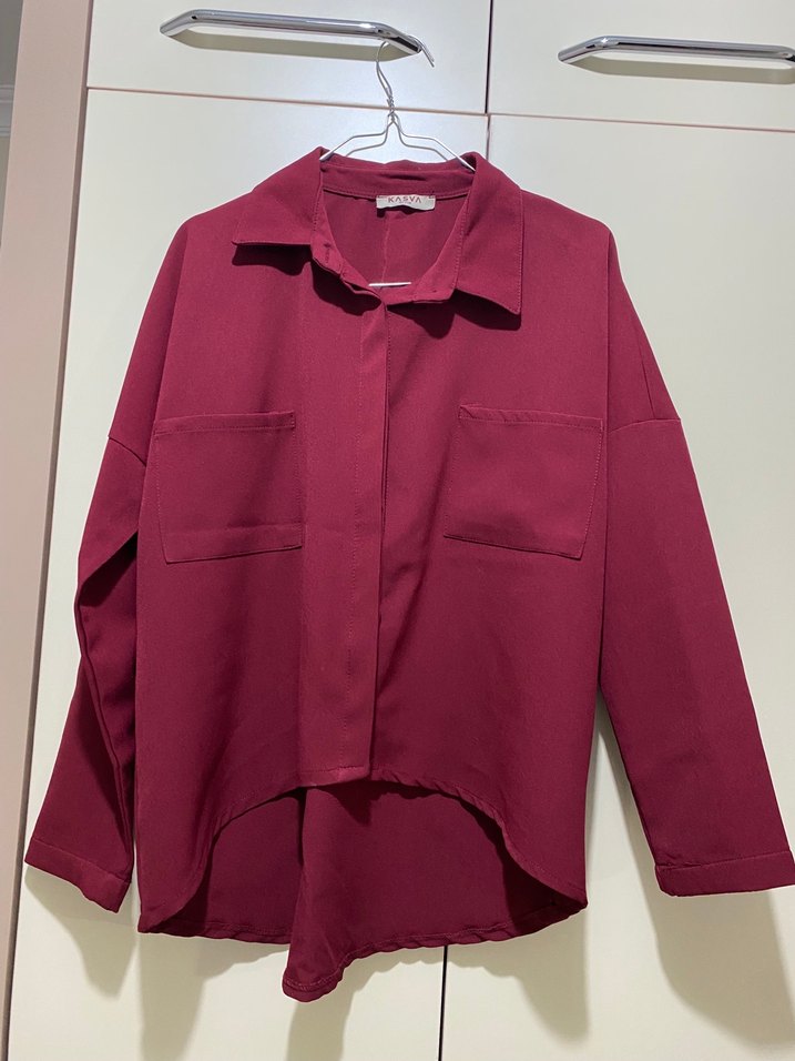 Bordo renkli, uzun kollu, düğmeli ve salaş kesim kadın gömlek. Notlu yaka ve midi boyda, hafif uzun arka kısmı ile günlük kullanıma uygun 38 beden olanlar tercih edebilir