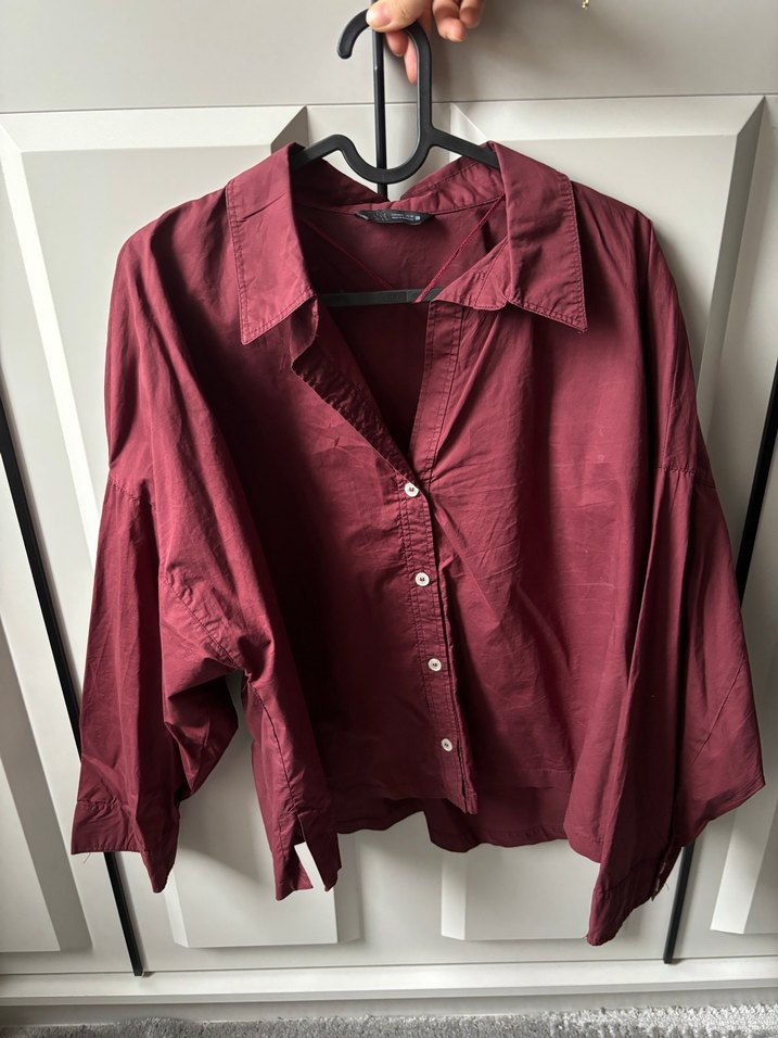 Bordo renkte, düğmeli, salaş kesim, yakalı ve uzun kollu keten gömlek. Rahat ve günlük sokak stili için uygun.