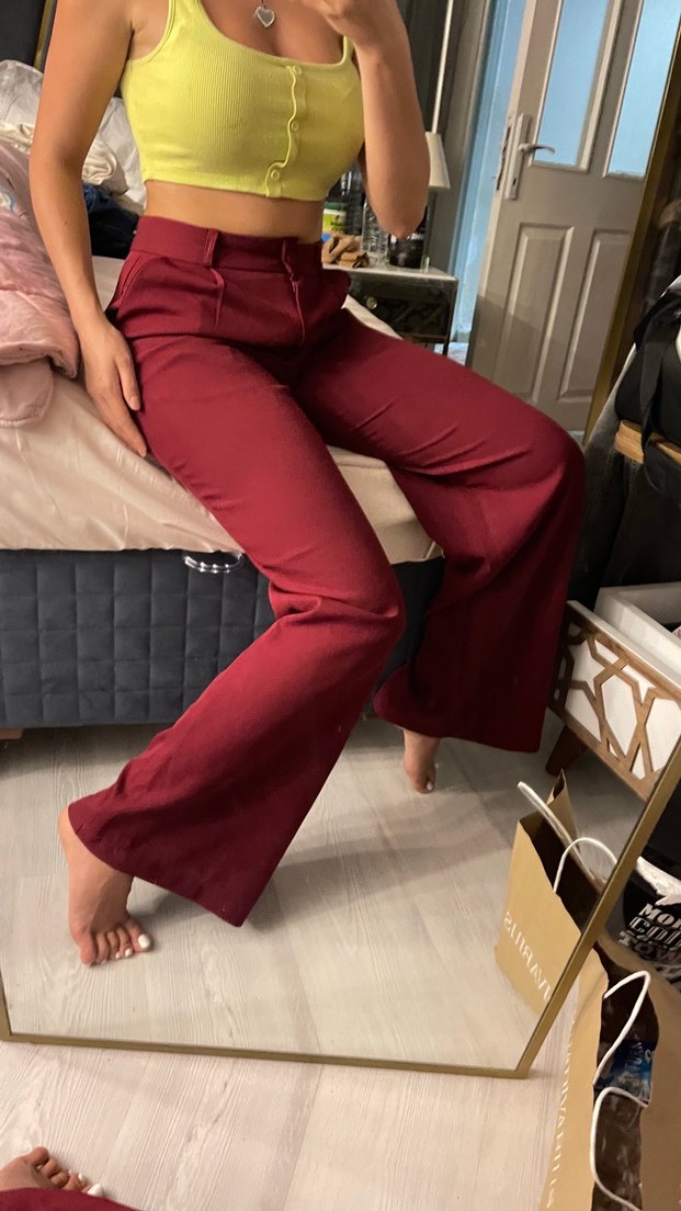 Bordo renk, düğmeli, salaş kesim, midi boy ve ipeksi dokulu kadın pantolon. Ofis ve günlük şehir stiline uygundur.