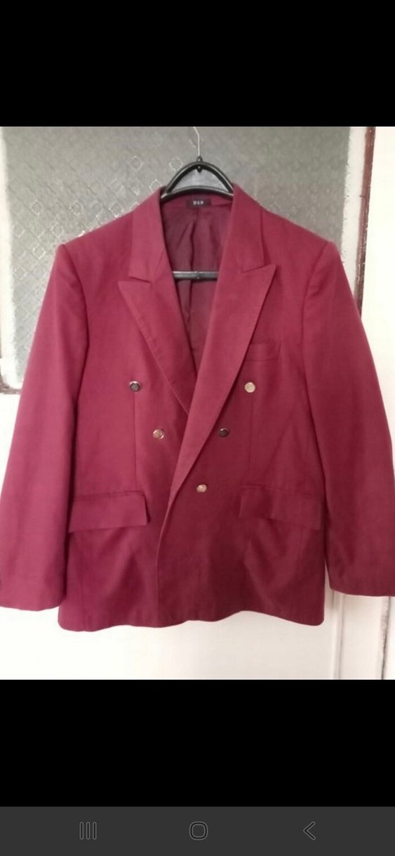 Bordo renkli, düğmeli, uzun kollu ceket. Normal kesim klasik takım elbisedir. Fotoğrafta görüldüğü gibi bir kolunda düğmesi yok . Başka bir sıkıntısı yoktur.