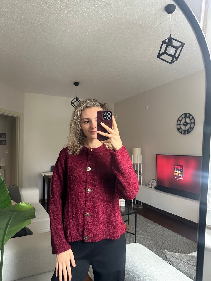 Bordo renkte, düğmeli, uzun kollu ve triko kumaştan yapılmış, normal midi boyda, bol kesim bir hırkadır. Günlük kullanıma uygundur.