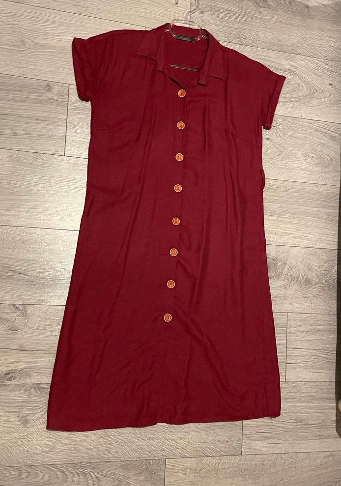 Bordo renkli, kısa kollu, V yaka ve düğmeli uzun elbise. Rahat kesimi ve yumuşak sentetik kumaşıyla gündelik kullanıma uygundur.