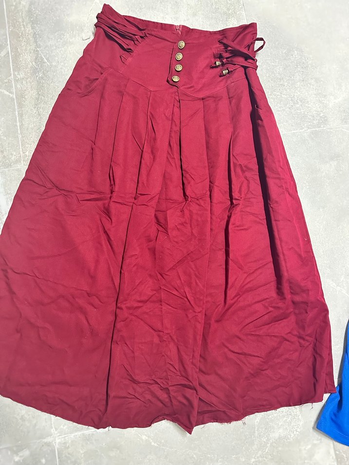 Bordo renkli, keten kumaştan yapılmış, düğmeli ve bol kesim uzun etek. Vintage bohem tarzıyla günlük kullanıma uygun.
