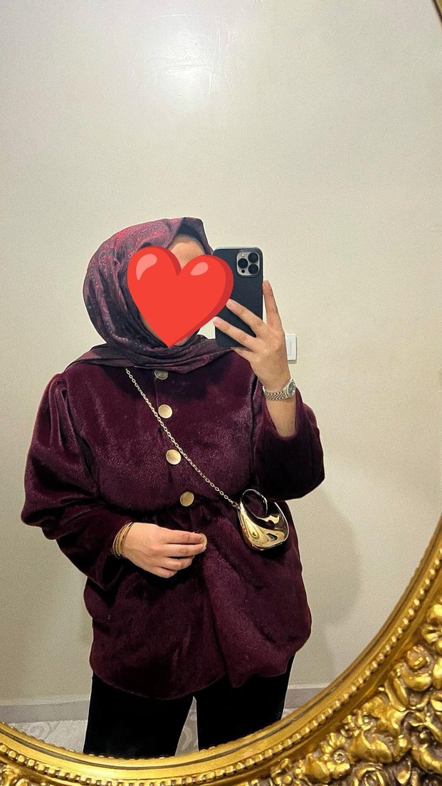Bordo renkte, uzun boy, bol kesim, yüksek yakalı kadife ceket. L Xl bedenler için uygundur