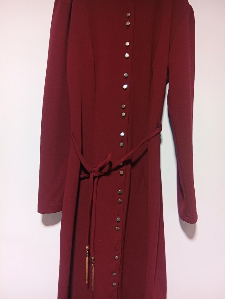Bordo renkli, düğmeli ve kemerli, uzun kollu, ince kesim kadın Elbise. Ofis kullanımı için uygun, sentetik kumaştan üretilmiştir.