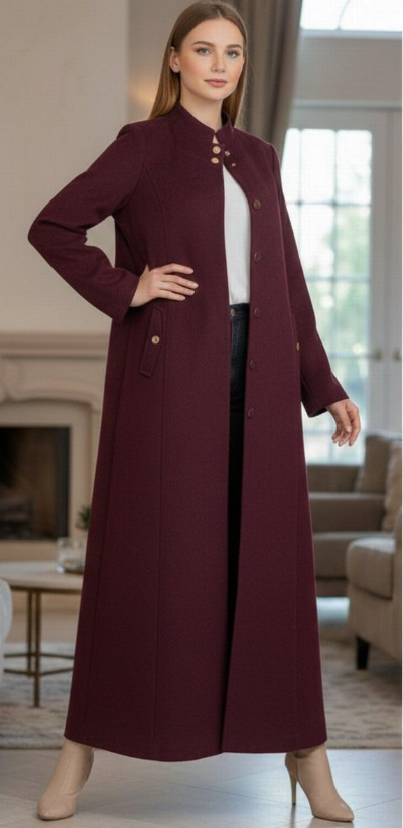 Bordo renkli, düğmeli uzun kadın kaban. Yumuşak ve sıcak kumaştan, klasik kesim ve uzun kollu, ofis için uygun. Göğüs:90 Cm. Bel: 96 Cm. Kalça: 112Cm. Boy: 133 Cm.Kol Boyu: 58 Cm. Marka: Abacı. Kendi etiket kartımla gelicektir.