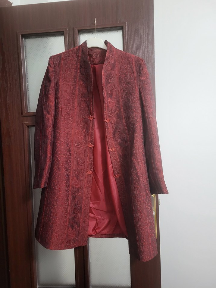 Bordo, parlak, ipeksi kumaştan yapılmış uzun kadın ceketi. Düğmeli ve klasik yakalı, abiye vintage tarzda, rahat kesim.Marka temsili