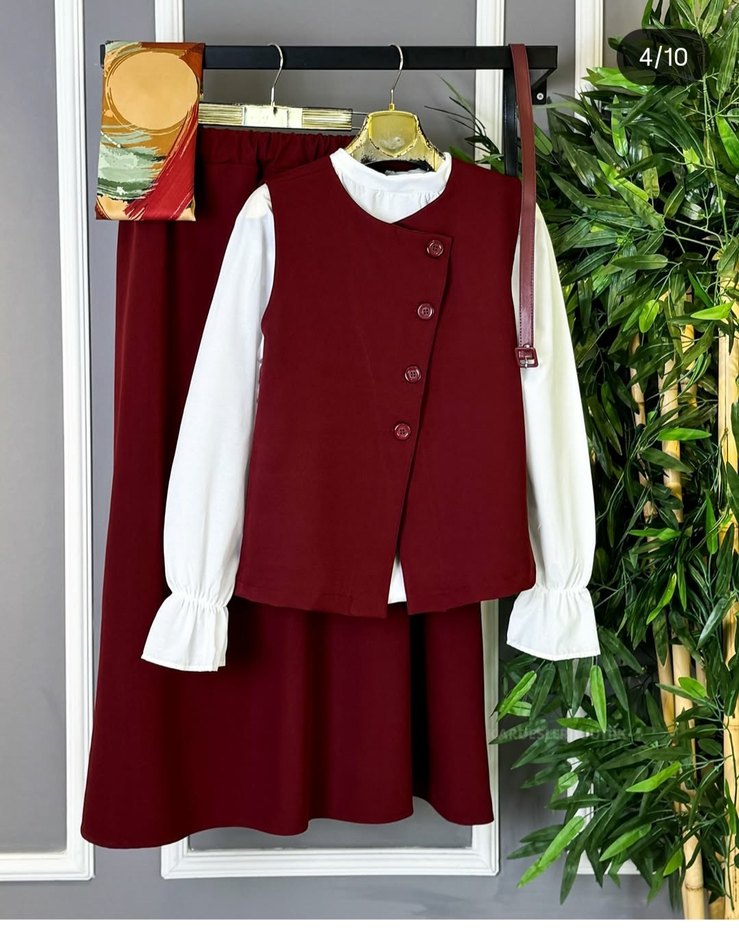 Bordo renkli, düğmeli, yakalı kolsuz yelek ve uzun etekten oluşan kadın takımı. Sentetik kumaştan, ofis stiline uygun, klasik kesim.