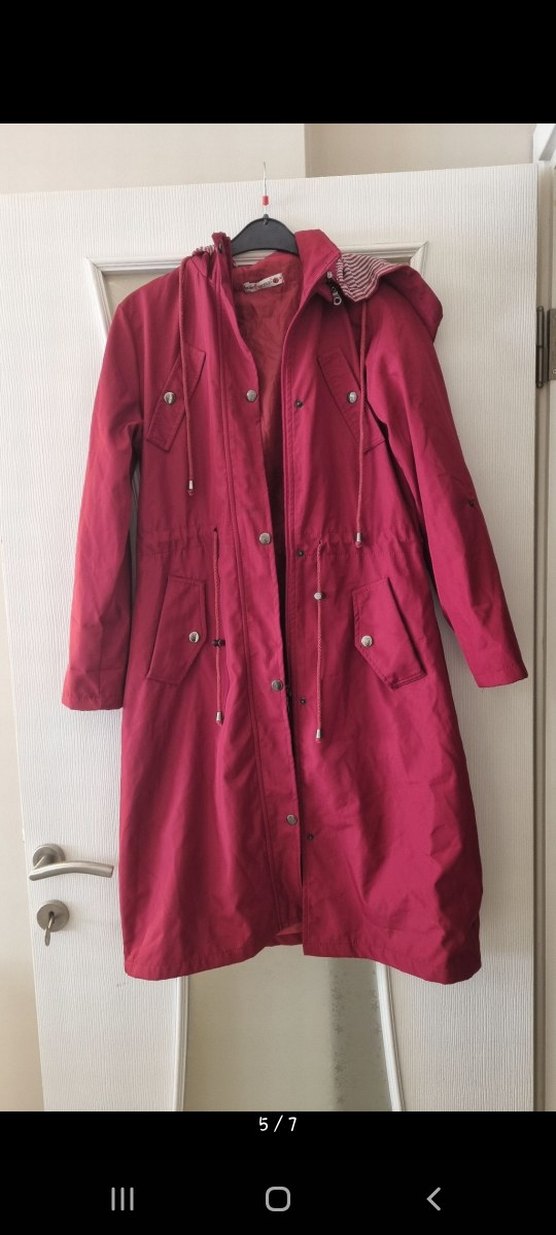 Bordo renkli, düğmeli ve uzun kollu kadın yağmurluğu. Notlu yaka ve bol kesim ile günlük kullanıma uygun, parlak sentetik kumaştan üretilmiştir. ️