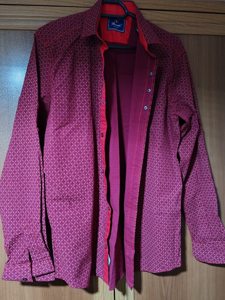 Bordo renkli, düğmeli, uzun kollu erkek gömleği. Notched lapel yaka ve regular fit kesime sahip, sentetik kumaştan üretilmiştir. En 43 boy 70 cm