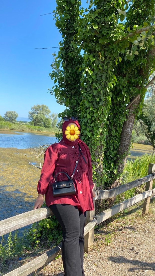 Bordo renkte, yüksek yakalı, uzun kollu ve düğmeli Sentetik kumaştan, hafif batik desenli ve rahat kesimlidir. ️