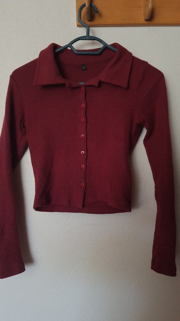 Bordo renkli, düğmeli ve yakalı kadın kazak. Uzun kollu, yumuşak yün kumaştan, midi boy ve vücuda oturan kesim.