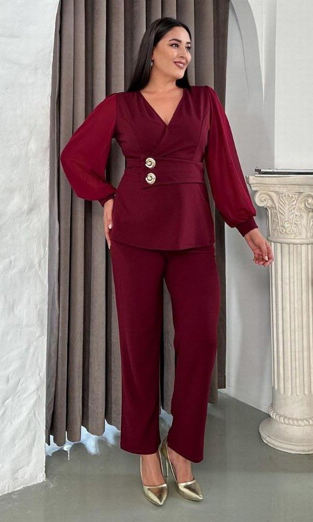 Bordo renk, V yakalı, uzun kollu ve düğmeli kadın takımı. Regular kesim ve uzun boyda, sentetik kumaştan üretilmiştir. Ofis kullanımı için uygundur. 44-46-48-50-52-54 beden aralığı mevcut