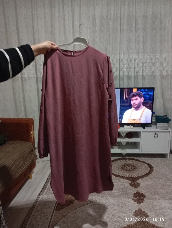 Bordo renkte, düğmeli uzun kollu, salaş kesim kadın tunik. Yuvarlak yaka ve normal midi boyda, sentetik kumaştan üretilmiş gündelik rahat kıyafet.