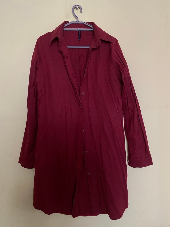 Bordo keten kumaştan, uzun kollu, düğmeli ve yakası kesimli, bol kesim midi uzunluğunda gömlek. Rahat ve sade tarz için uygun.