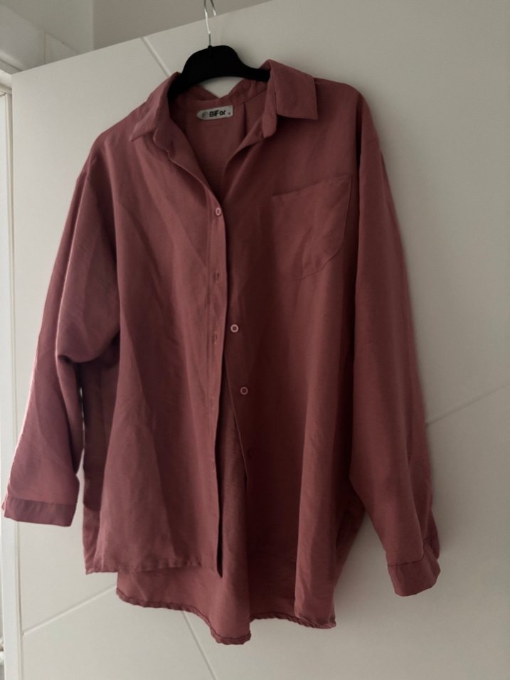 düğmeli, uzun kollu gömlek. Gömlek yakalı, bol kesim ve parlak dokusu ile günlük kullanıma uygun sade bir stil sunar.