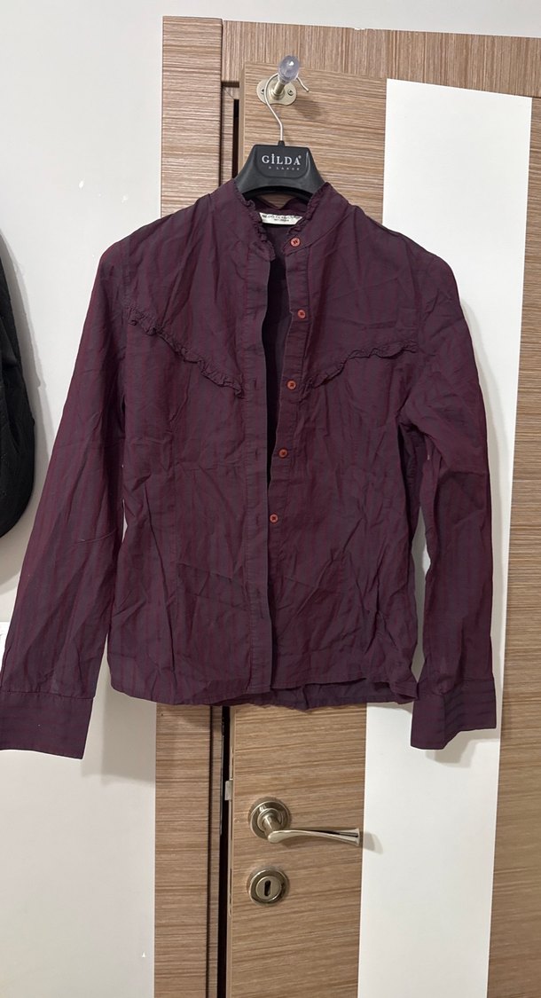 Bordo Düğmeli Uzun Kollu Keten Gömlek