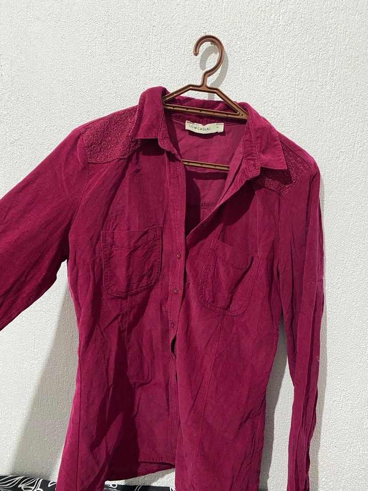 Bordo renkli keten gömlek, yakalı, uzun kollu ve bol kesimdir. Parlak görünümlü, düğmeli ve gündelik bohem tarz için uygundur.