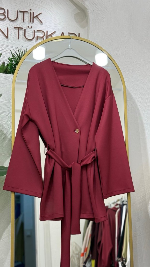 Bordo renkte, düğmeli ve kuşaklı, uzun kollu, notched lapel yakalı, bol kesim kadın kimonosu. Yumuşak sentetik kumaştan imal edilmiştir. 38-40 beden uyumludur.