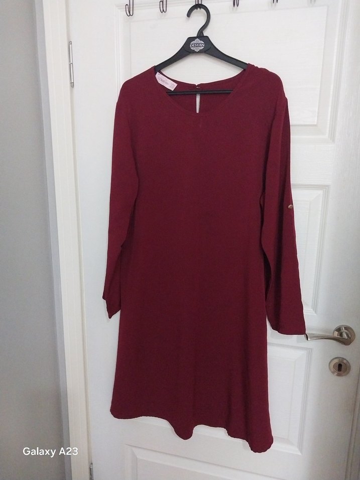 Bordo renkli, uzun kollu ve düğmeli bu tunik, satenimsi dokusuyla rahat bir kesime sahiptir. Normal midi boyda, minimalist şıklık için uygundur.