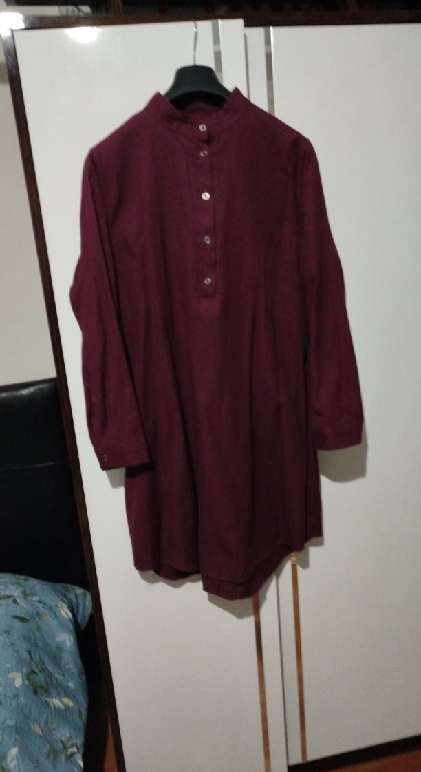 Bordo renkli, yüksek yakalı ve uzun kollu midi tunik. Keten kumaştan, düğmeli ve bol kesim. Minimalist ve bohem tarzda, günlük kullanım için uygun.