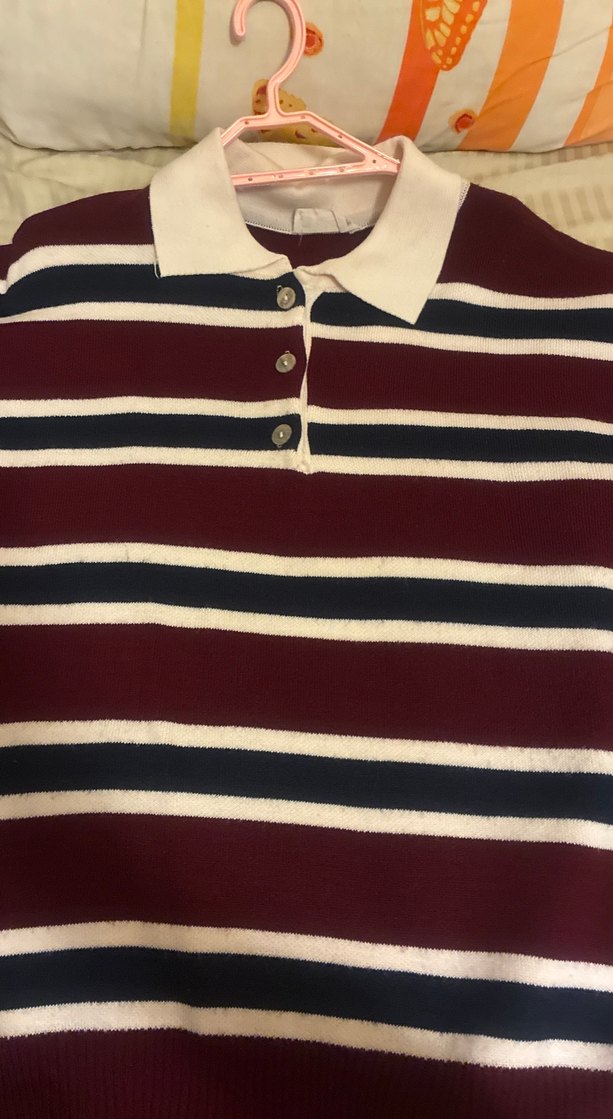 Pamuklu, düğmeli yakalı ve uzun kollu bu bordo polo triko. rahat kesimi ve beyaz-lacivert çizgileriyle günlük sokak stiline uygundur. Öğrenciler faydalansın ihtiyaç fazlasıdır. 1 kez giydim kesime yakıştırmadım.