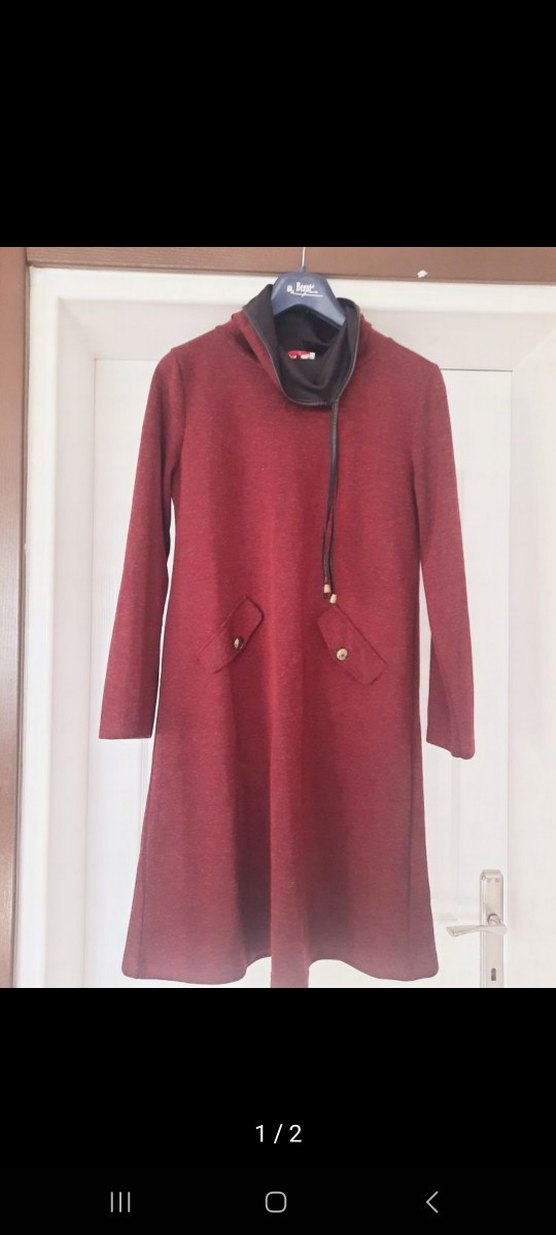Bordo renkte, düğmeli detaylı, uzun kollu ve yüksek yakalı tunik. Yumuşak ve sıcak kumaştan olup rahat kesimlidir, günlük sokak stiline uygundur.