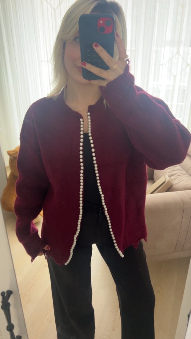 Bordo renkli, düğmeli, uzun kollu triko hırka. Gevşek kesimi ve yuvarlak yaka detayıyla rahat ve günlük kullanıma uygun.
