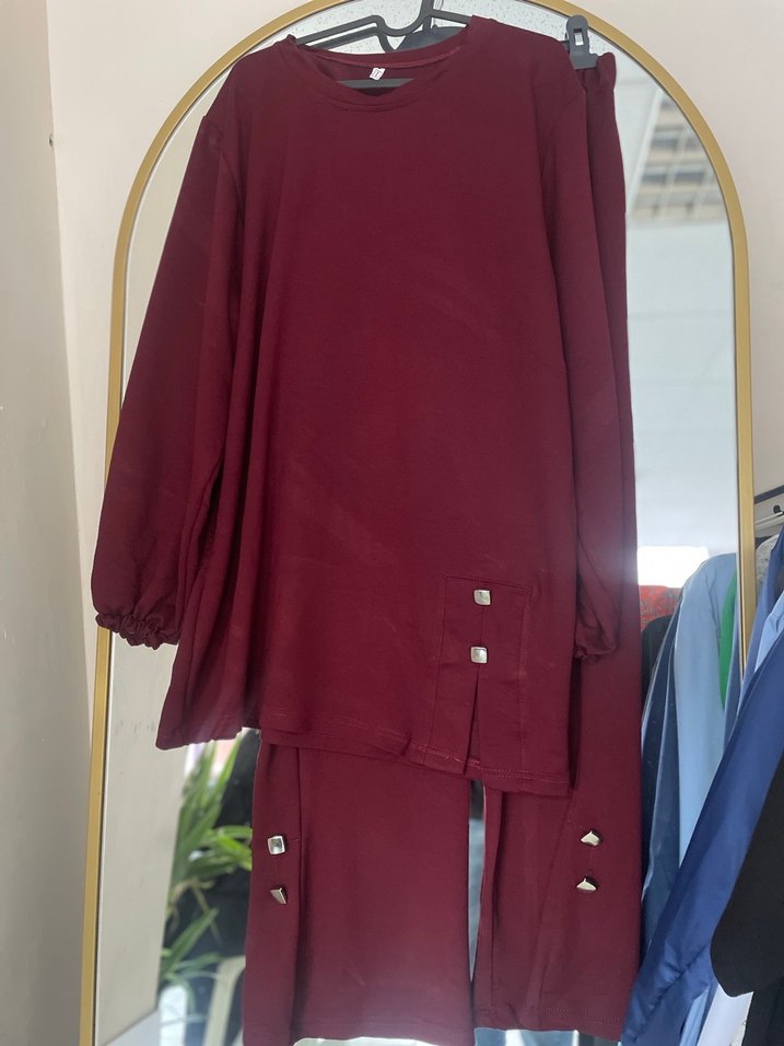 Bordo Düğmeli Uzun Kollu tunik pantolon takım