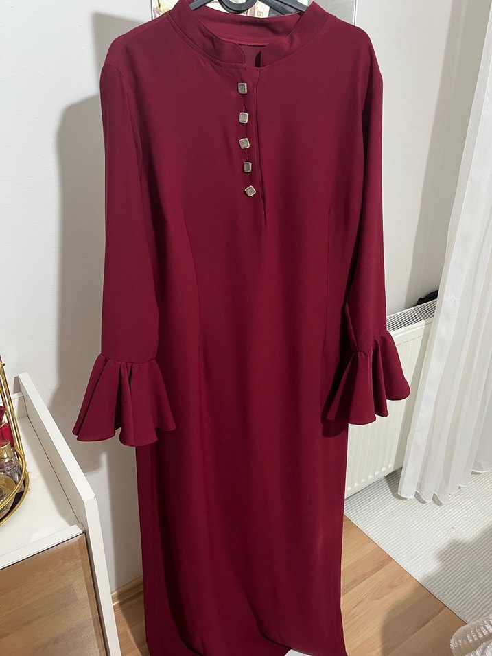 Bordo renkli, uzun kollu ve volanlı manşetli düğmeli uzun elbise. V-yaka ve parlak dokusuyla ofis için modern klasik bir görünüm sunar.