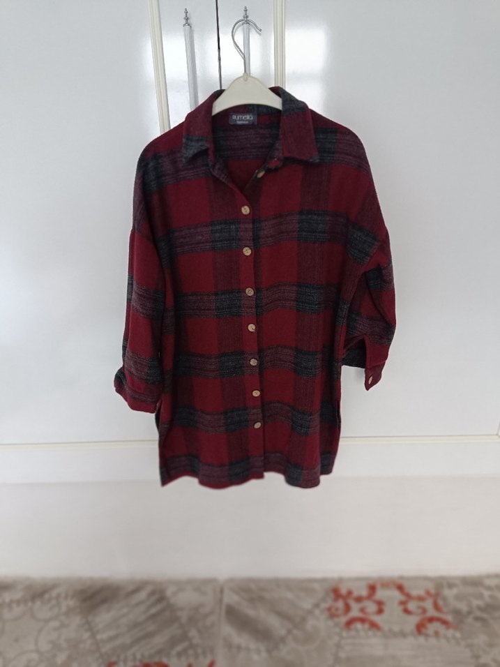 Bordo renkli, yün kumaştan, düğmeli ve uzun kollu bol kesim gömlek. Notch yaka detayıyla rahat sokak stili için uygundur.