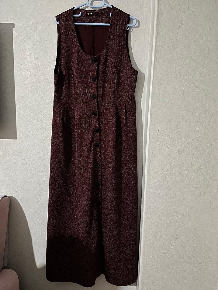 Bordo renkli, düğmeli, kolsuz uzun elbise. Yün kumaştan, normal kesim ve minimal tarzda, günlük kullanıma uygun.