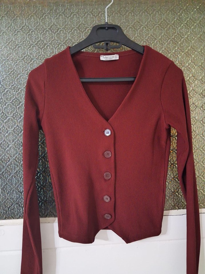 Bordo renkli, düğmeli, V yaka, uzun kollu, normal boyda, yumuşak triko kumaştan yapılmış kadın bluz. Günlük kullanım için uygundur.