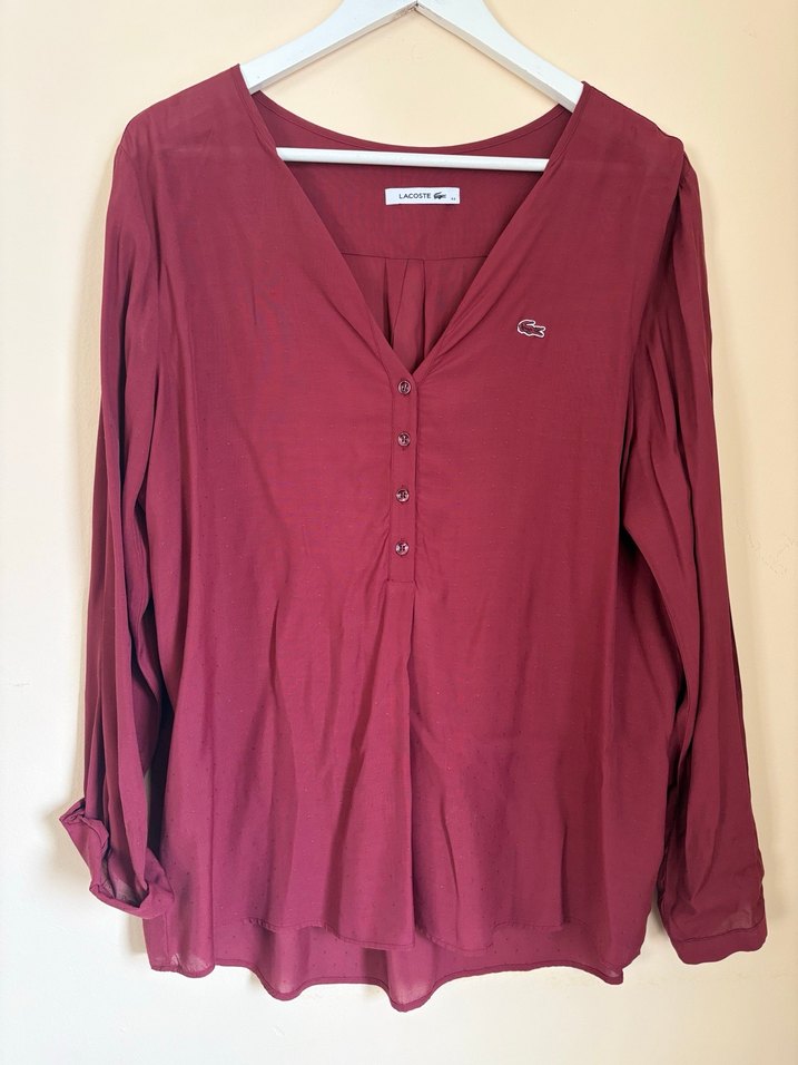 Bordo renkli, uzun kollu, V yakalı, düğmeli ve rahat kesime sahip kadın gömleği. İpeksi kumaştan üretilmiş, temiz defosuz cok az kullanıldı 44 beden Lacoste ürünü