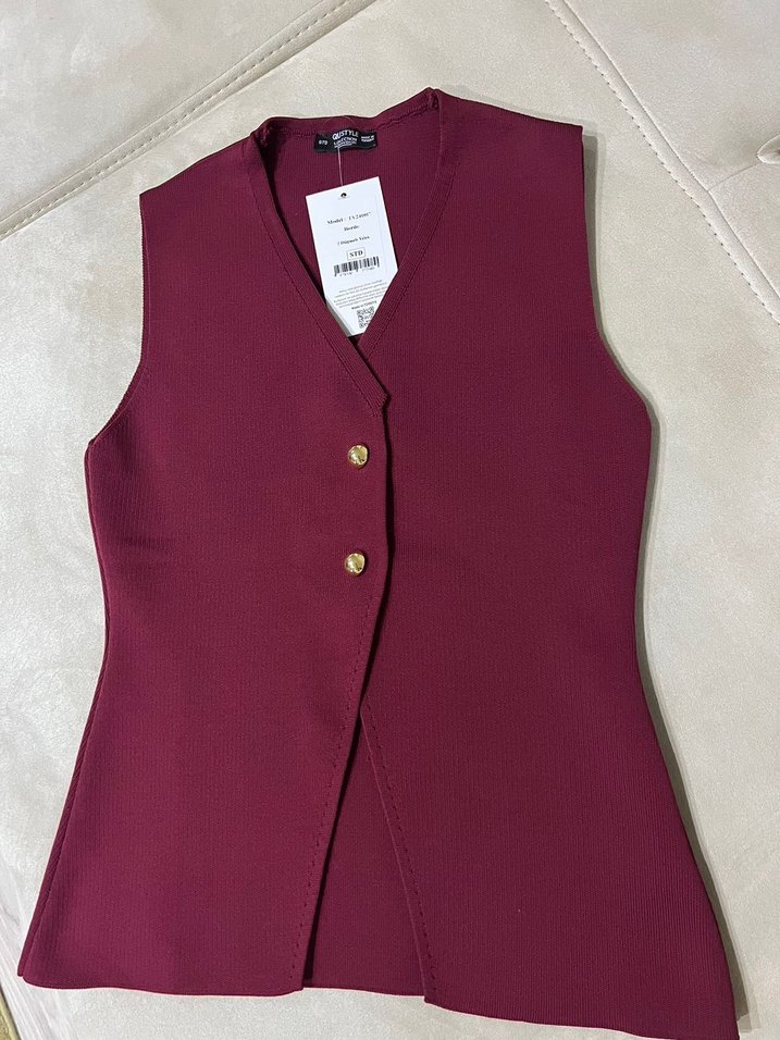 Bordo renkli, düğmeli ve V yakalı kadın yelek. Sentetik kumaştan, midi boyda ve normal kesim. Ofis kullanımı için uygun.