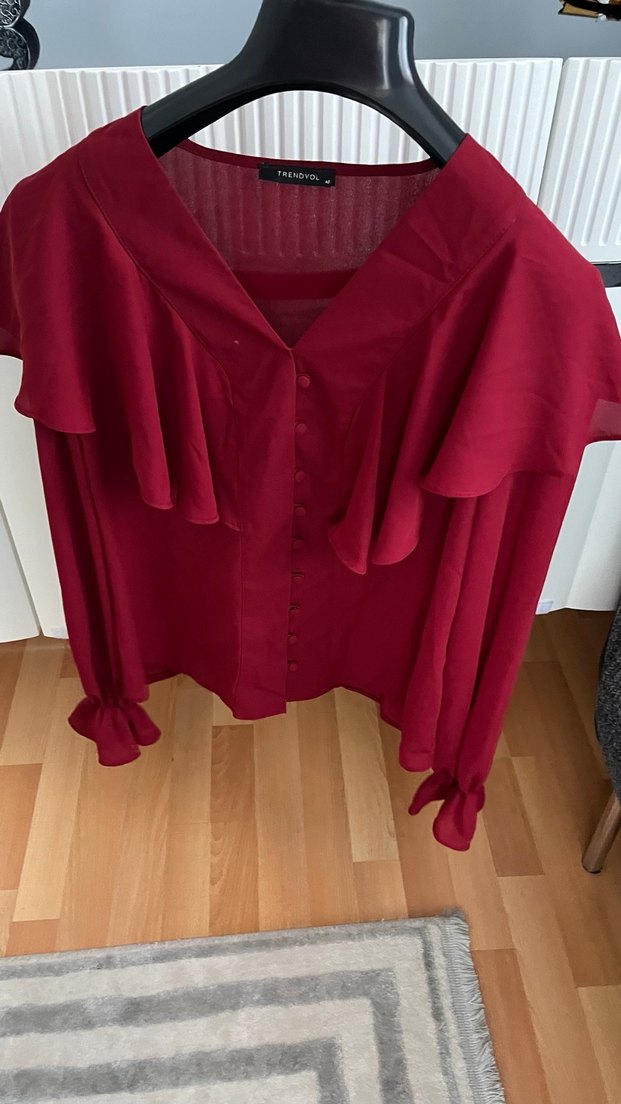 Bordo Düğmeli V Yaka Uzun Kollu Kadın Bluz