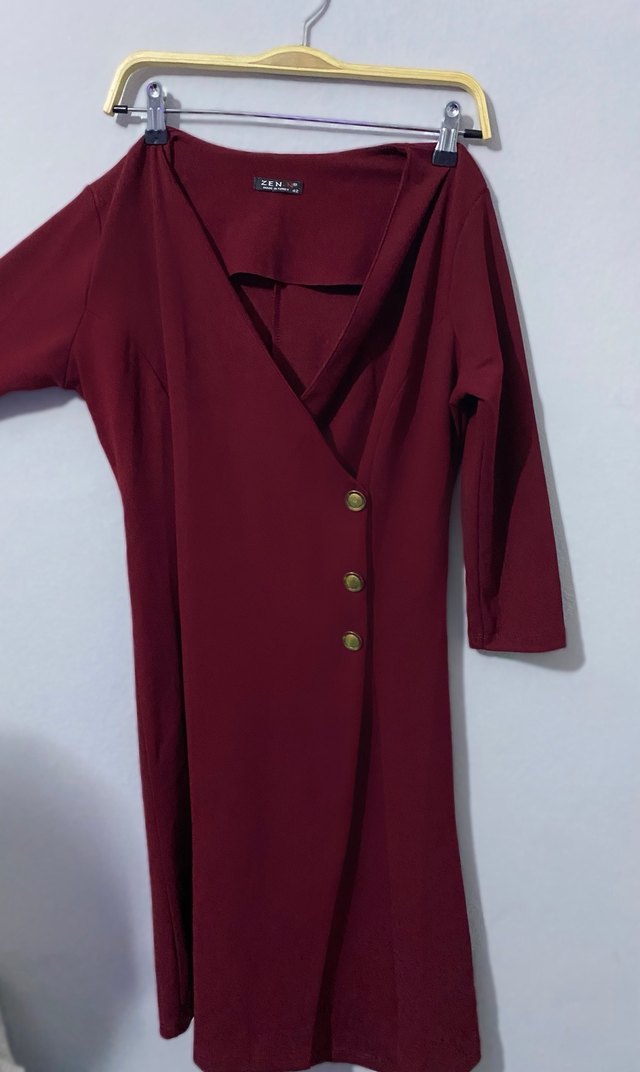 Bordo Düğmeli V Yaka yarım kollu Elbise