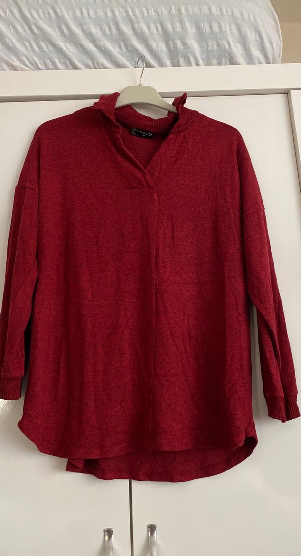 Bordo renkte, yüksek yakalı, uzun kollu ve düğmeli detaylı kadın kazağı. Yumuşak keten kumaştan, rahat ve bol kesimdir.