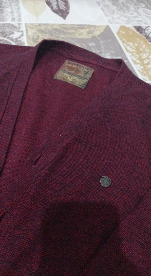 Bordo renkte, düğmeli, yün erkek hırka. Notched lapel yakalı, uzun kollu, midi boy, bol kesim ve günlük kullanım için uygun.