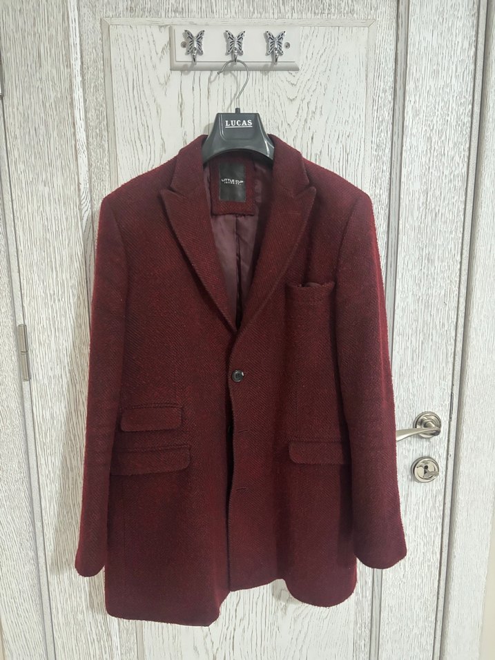 Bordo renkli yün kumaştan yapılmış, düğmeli ve klasik kesim erkek ceket. Uzun kollu, midi boyda ve ofis için uygun şık tasarım.