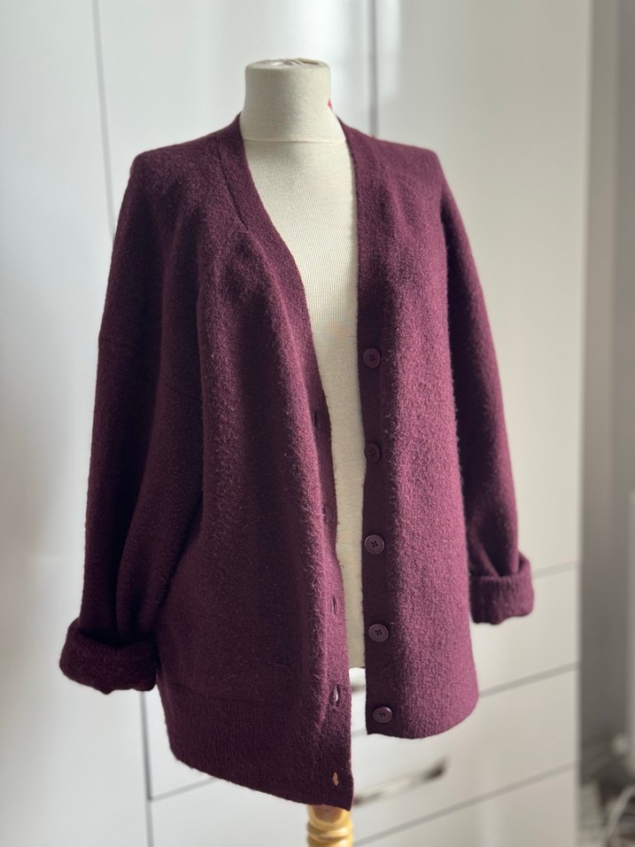 Bordo renkli yün hırka, düğmeli ve yakalıdır. Salaş kesim, uzun kollu ve midi boyda olup günlük kullanıma uygundur.