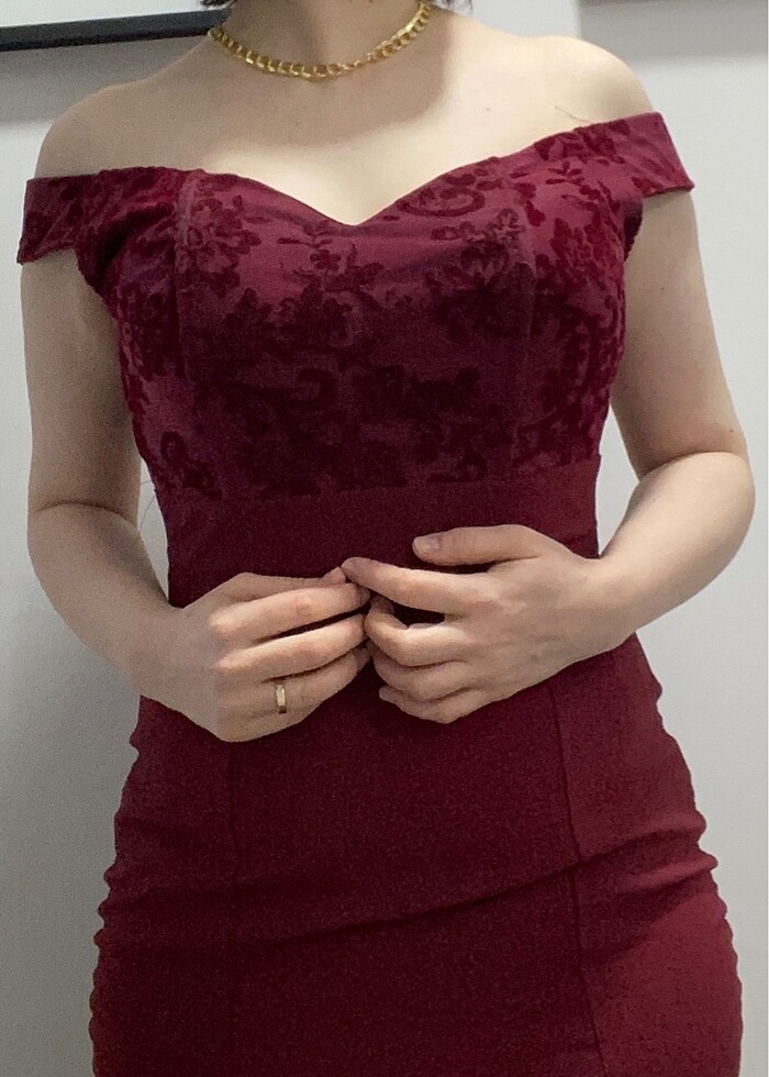 Göğüsten aşağıya elbise boyu 138 cm Bordo düşük omuz dantel kuyruklu balık abiye Kuyruk kısmında hafif bir delik var tamir ettirebilirsiniz