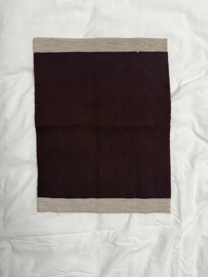 Açık bej kenar detaylarına sahip, düz desenli koyu bordo renkte boyunluk. İçerik kâğıdını rahatsız olduğum için kopartmıştım. Son fotoğraf içeriği için eklenmiştir. Sadece 1 kez kullanıldı.