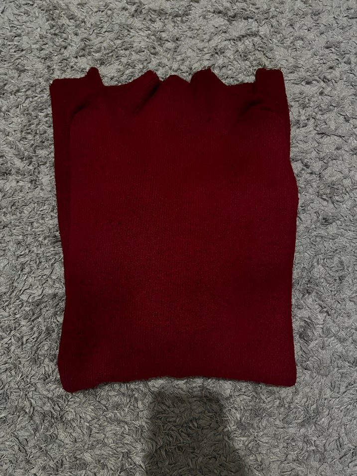 Gri zeminde düz bordo renkli, yumuşak dokulu kazak ürün temizdir