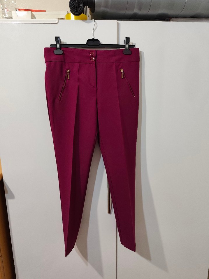 Bordo renkli, düz kesim ve midi boy kadın pantolon, yumuşak sentetik kumaştan ve fermuarlı ceplerle. Ofis ve sokak stiline uygun.