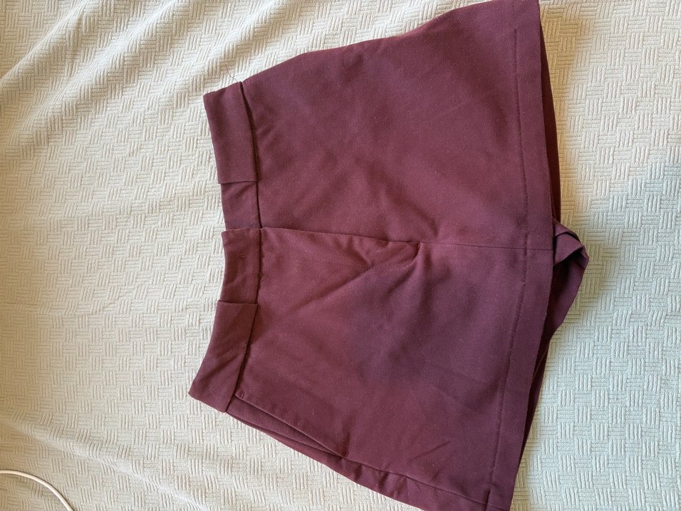 Bordo renkte, A kesim şort etek Düz ve yumuşak kumaştan, arkası etek görünümlü . 40 beden fakat ben giyebilmek için belini daralttım fakat hiç giymedim 38 beden şuan ki hali . Hiç giyilmedi