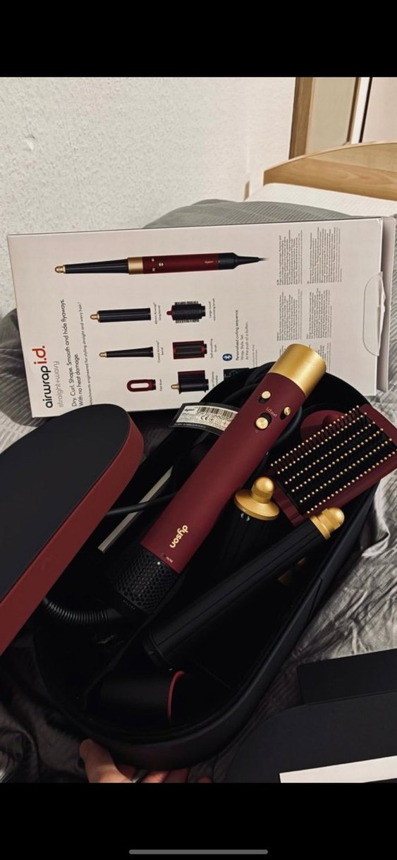 Bordo renkli Dyson saç düzleştirici, çeşitli başlıklar ve altın detaylarla birlikte gelir. Kutu ve taşıma çantası dahildir. ♀️