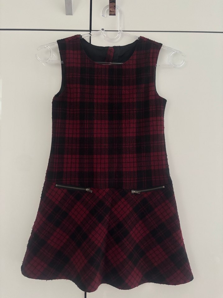 Bordo ve siyah ekose desenli, astarlı kolsuz kız elbisesi. Regular kesim, bisiklet yaka ve önde fermuar detayları bulunur. Kaşe kumaştan yapılmıştır.