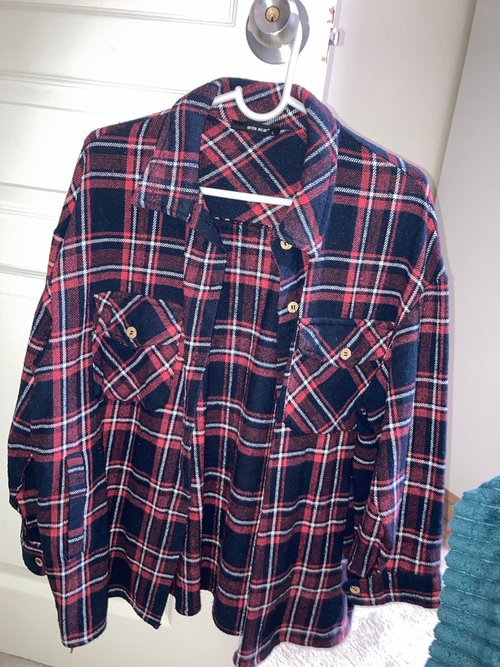 Bordo renkli, ekose desenli bu gömlek bol kesim, uzun kollu ve yakalıdır. Düğmeli detaylara sahip, midi boyda ve rahat tekstil kumaştandır.